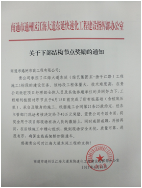 5月24日晚九點(diǎn),隨著江海大道東延一標(biāo)圩亭河橋右幅3#橋臺(tái)澆筑結(jié)束,標(biāo)志著我公司承建的江海大道東延一標(biāo)下部結(jié)構(gòu)(樁基礎(chǔ)含樁底壓漿、承臺(tái)及墩身)的施工在全線七個(gè)標(biāo)段中率先完成,比合同約定完成的節(jié)點(diǎn)時(shí)間提前了22天。受到工程建設(shè)指揮部的表彰和節(jié)點(diǎn)獎(jiǎng)勵(lì)。
